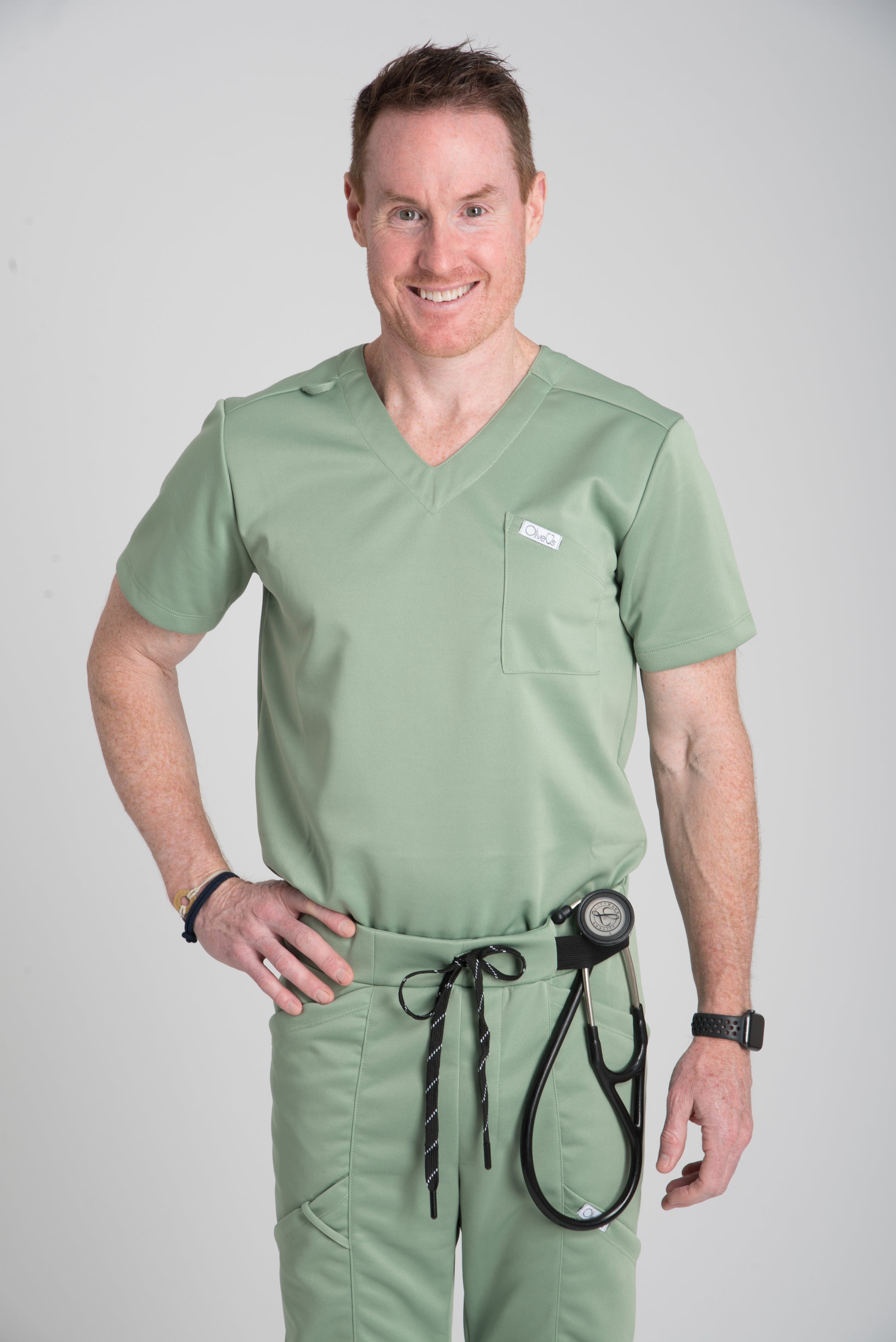 Custom anti-wrinkle, soft, and antimicrobial fabric with left chest pocket and badge loop.